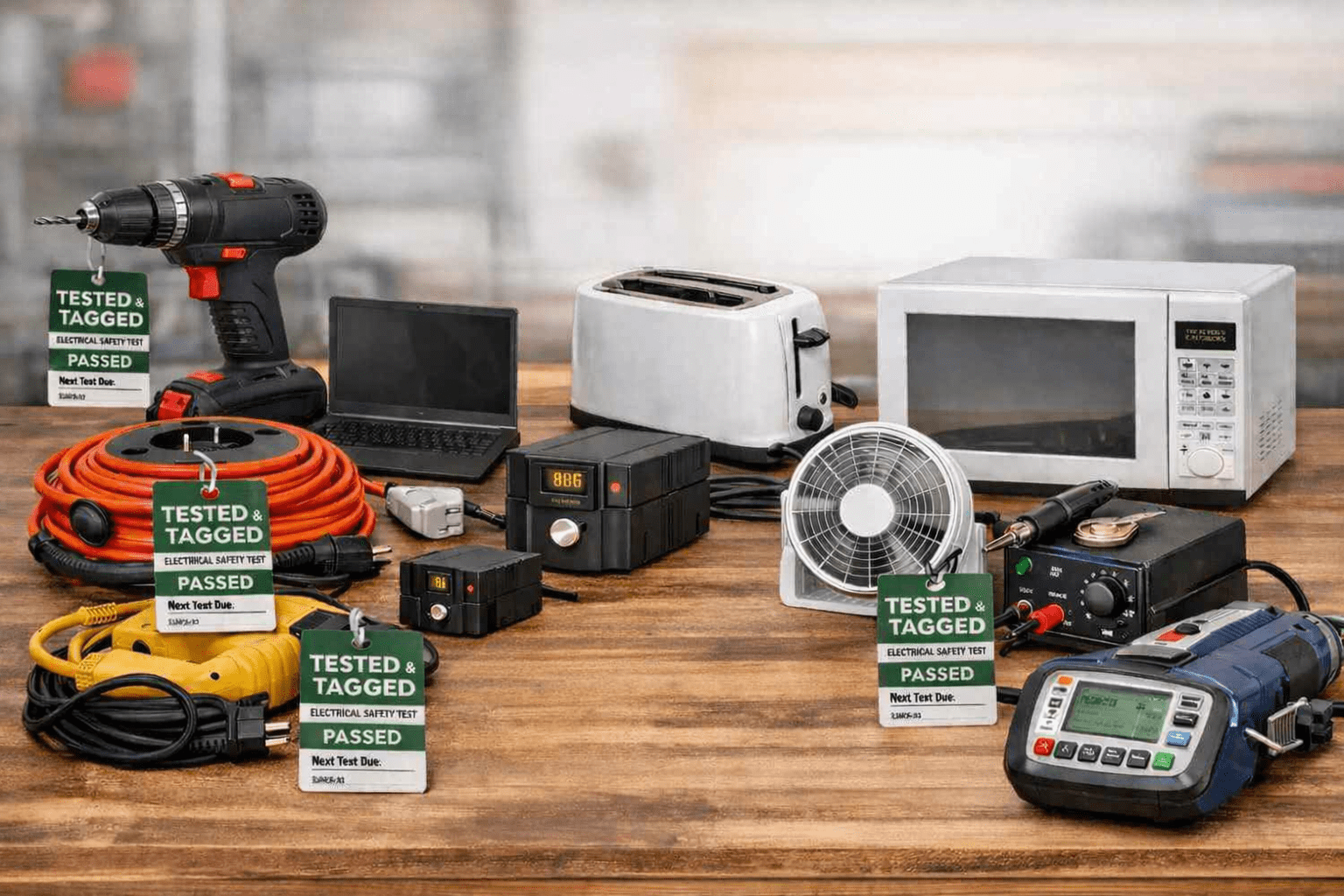 Portable electrical appliances, power tools, extension leads, office equipment, kitchen appliances, and any plug-in device used in the workplace.
